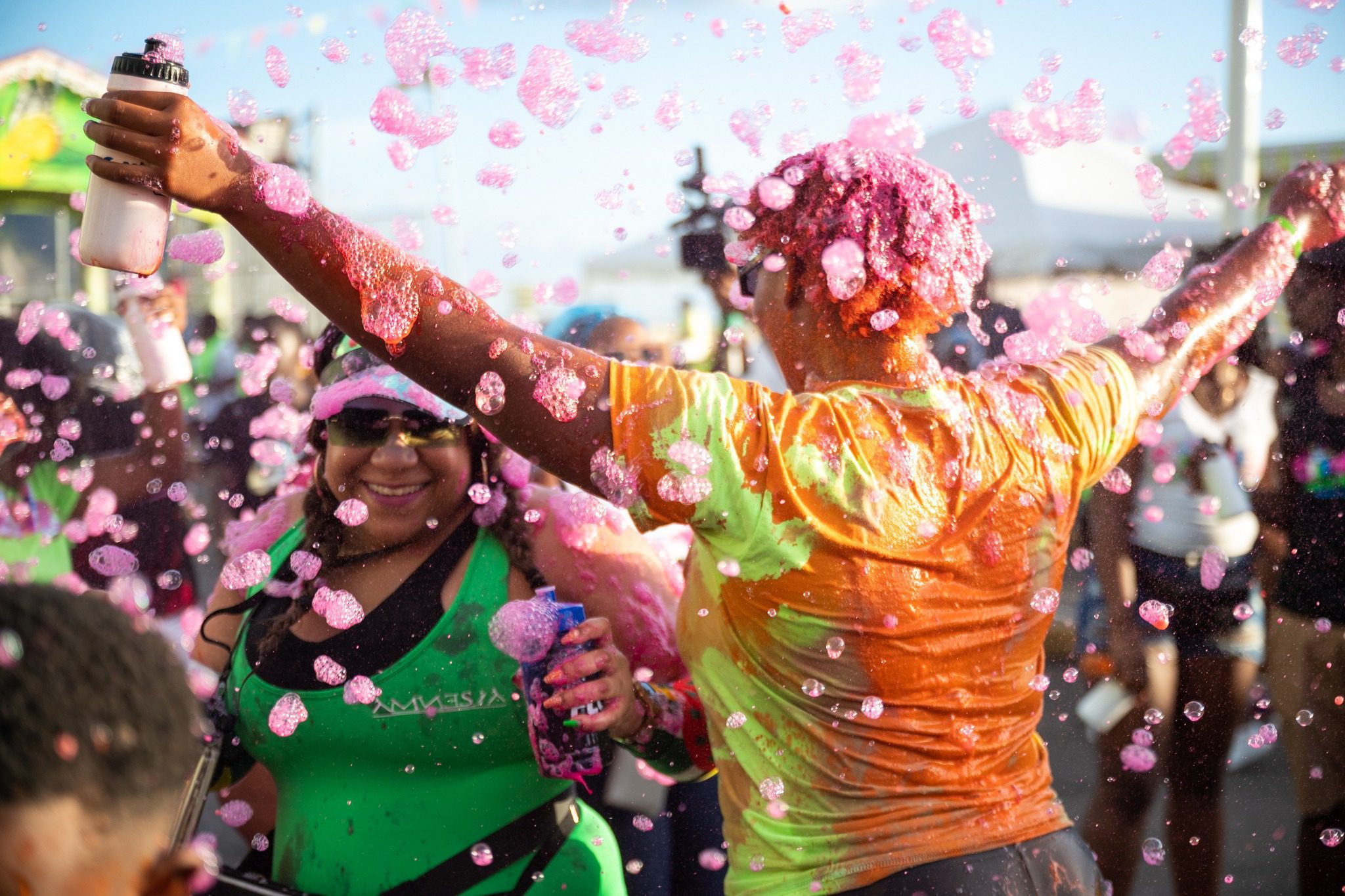 The Minister made a royal mess in a CrazyMess t-shirt band with water blasters, foam, paint and a water truck. Melissa Skerrit was seen wearing a parrot-coloured off-shoulder top which she paired with black shorts and black shoes.